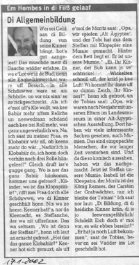Was gibt es Scheeneres, als iwwer annere Leit ze redde? Iwwer annere Leit ze redde und dabei sich selbst nicht ganz zu ernst nehmen und mit einem Augenzwinkern selbstkritisch zu betrachten.