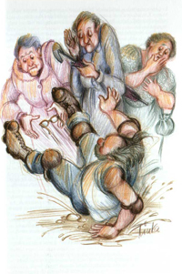 Die „Kreiznacher Schdiggelcher“ erzählen zum Beispiel auch vun zahnlose Graue Panther (Hornbergers Zähne sind übrigens noch alle original), vun seltsame Geräusche, vun de Beerdichung, vumm Schlachtfescht, vumm Schbass in de Badewann, de ewich Juchend, vumm Johrmarkt, vun ebbes Maschinlles for de Haushalt, von de eichen Fraa, vun Kreiznacher Gässjer oder vun de Krischkinncher. 39 Geschichten sind zusammengekommen, illustriert vom Kreuznacher Fred Lex. Der hat die Beiträge mit hintergründigem Witz karikiert, wer genau hinschaut, entdeckt den Hombes hier und da, nicht nur auf der Titelillustration von Lex.