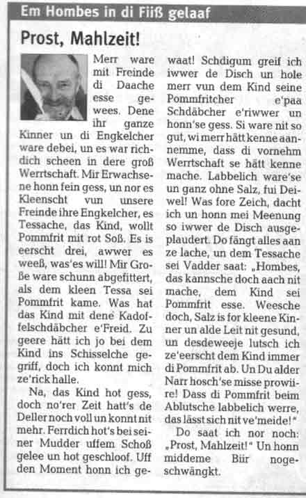 Es gibt widder so viil ze ve'zehle, merr glaabt's nit, iwwer was merr alles schreiwe kann! Es bescht is, merr leest's selbscht, dann kimmt merr es schnellscht dehinner. Wer mei beschder Freind is, das werrd merr noleese kenne. Was e'Zuckerkaffeleffelche fore Funktzjion hot, schdeht drin. Wo ich mei eerscht Uhr her honn, wi ich draan kam, leest merr no. Wi ich Gaadebänkelcher zesammenaale, schdeht drin, selbscht mei erotische Erfahrunge bleiwe kee Geheimsach! Schdiggelcher vun de Engkelcher honn ich nit ausgeschbart un hi un do e'Schdiggelche aus de Zeidung, zum Beischbiil, was es scheenschde Kreiznacher Wort is. Ich honn gemeent, es wär de Dibbschisser, weil in dem Wort aach es Gehaichnis drin is, was viile annere Leit gemeent honn, dass das unser scheenscht Wort wär. Doch was heeßt do scheenscht Wort? Das gibt's jo ganit, genau so wenich, wi's di scheenscht Fraa nit gibt!