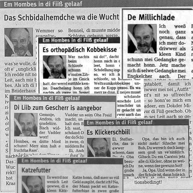 ![]() Der Tag beginnt.... -....middem Leese vumm "Effentliche",richdich heeßt di Daacheszeidung "Oeffentlicher Anzeiger". Es is di Rechionalzeidung vun de "Rhein-Zeitung" in Kowwelenz. De pur Zufall war' s-Ein Fotowettbewerb des Oeffentlichen Anzeigers war an allem "schuld"Als der Oeffentliche Anzeiger im Jahre 1960 einen Fotowettbewerb ausschrieb, den ich damals mit einem Sportfoto gewann, fragte mich der damalige Besitzer der Zeitung, Herr Ferdinand Harrach, ob ich nicht für die Zeitung Sportbilder fotografieren möchte. Da ich im Fotoclub e.V. war, reizte mich das Angebot sehr. Außerdem wurden mir meine Bilder auch noch bezahlt. Ich "stieg" voll ein, kaufte mir einen Vergrößerungsapparat, die nötigen Entwicklungsschalen und machte unser Badezimmer zum Labor. Von da ab war ich Sportfotograf und fuhr mit meinem Moped, das ich mir noch anschaffen musste, den ganzen Landkreis ab, und "klapperte" am Wochenende die Sportplätze und Sporthallen ab, um meine Bilder zu schießen. Mit dem Moped bis nach Bärweiler bei Kirn, das waren schon Unternehmungen. Das Honorar lag damals bei 5 DM pro Bild! Von lukrativem Geschäft konnte keine Rede sein, es war mein sich selbst finanzierendes Hobby. Die Freude am Fotografieren ließ mich die Strapazen vergessen. Bald fotografierte ich auch für die Kreisredaktion der Zeitung und später hie und da auch Fotos aus dem Lokalgeschehen der Stadt. Bei der Fassnacht, den Kleingartenfestchen oder bei Kirchenchören. Die vielen Bälle fotografierte ich mit großem Eifer und Interesse im Bad Kreuznacher Kurhaus. Nichts auf dem Gebiet war wir fremd, auch Werbeaufnahmen für die Chrysanthemen-Großgärtnerei Hartmann fielen an. Meine Freizeit war voll ausgefüllt und die Familie hatte in dieser Zeit recht wenig von mir."Der Papa ist fotografieren!" war der Standartsatz zu Hause. Also, seit l960 honn ich for de "Effentliche" Bilder gemacht, foddegrafiirt un aach entwickelt. Seit e' paa Johr honn ich das awwer ingeschränkt, es wa merr zu schtressisch un ich honn aangefang "Schdiggelcher" ze schreiwe, in Mundart nadiirlich. Em Hombes in di Fiiß gelaafhonn ich di Glosse genennt un seit e' paa Johr erscheine di Schdiggelcher vun Zeit ze Zeit in dere Zeidung, zur Freid, ve' leicht aach zum Ärjer vun de Leit, je nodem ob merr betroff is odder nit. Es liibscht simmer awwer di "Schdiggelcher" di ich iwwer mei Engkelkinnercher schreiwe kann, wenn di merr e' Grund liwwere. Di "Schdiggelcher" sinn nit erfunn, di hot' s Leewe geschribb. Aan dem Platz erscheine jetz for di intressiirde Hompädschgugger di akduelle "Schdiggelcher" aus' em Effentliche. E'Schdiggelche aus'em >Oeffentlichen Anzeiger<Die Weihnachtslieder sind verklungen.... .. Di Feijerdaache sinn e` rumm, vors Eerschde; was e` Glick! Mei Mudder saat frihjer schunn, vor iwwer verrzich Johr:“Merr graut` s widder vor de Feijerdaache!“ Heit weeß aach ich warum. Glöckleinklingeln, leise rieselnder Schnee, (hot den schunn e` mol eener blotze geheert?) odder de Tannebaam, vun dem merr jetz merkt, daß` er griin is, di „Kindlein“, di jetz all komme wolle, un si kame aach! O ha! Un vun der „stillen Nacht“ wa nix mehr ze heere! Wi das in ordentliche Famillje sich geheert, dodezu zähle merr uns, werrd’s eerscht gesung, bevor deno dann es Krischkinnche kimmt un merr dann di scheen Bescheerung hot. „Also,“ saat ich, als merr bei meine Dochder di Bescheerung gemacht honn,“lee di Platt uff un loss di Kinner singe, devor gibt’s nix! Es Krischkinnche kimmt immer erscht no’m Singe, das wa bei mir deheem schunn so.“ Di Platt leit uff, e’laude Biibston erschallet durch di Lüfte, un de Schwiirsohn schderzt aan de Pladdeschbiiler, er wa falsch ingeschdellt. Dann awwer: „Stille Nacht, heilige Nacht....“ das Liid kam ze frih, denn mei Dochder hatt’s Bimmelche nit gleich gefunn, do kame di Kinner schunn di Trepp e’runner geschderzt. „Sofort geht’er widder in Eijer Schdubb! Das Christkind ist noch nicht da gewesen und es hat auch noch nicht geklingelt!“ Wi uffgescheichte Hingel ve` schwinne di Kinner widder no owwe in ihr Schdubb. Merr suche mit alle Mann di Bimmel. – Dann hatt ich` se! Unnerm Krischbaam hatt’se im Krippche gelee. Scheint’s hatt’se der Kleen neewer di Kripp geleet, damit’ s Jesuskinnche nor nit inschläft, wenn’s Krischkinnche kimmt. Jetz hot di Dochder gebimmel un di „Heilige Nacht“ is schunn langsam geeje Moije gang, es wa di dritt odder virrt Schtroof am Laafe, als di Kinner di Trepp e’runner un in di Schdubb gerennt kame. Ihr Mudder kann nit singe, de Vadder is mit fünnefeverrzich noch im Schdimmbruch, nor de Kinner ihr Oma un ich, mir honn gesung: „...tööö önt es lauu ut von fe ern und naah: Chriiist der Retter ist daaaa aaaa! Chriist ist der Retter ist da!“ Do hatt der Kleenscht, es Steffanche, schunn sei eerscht Tutt aussordiirt un reißt am große Pageet es Babiir ab. „Das läschde sofort sein!“ schreit sei Mudder, un de Bub brillt. „Eerscht werrd gesung, sunnscht gibt’s nix! Merkt’s Eich! Das Christkind guckt durchs Fenster ob Ihr auch brav seid.“ saat de Kinner ihr Mudder im feinschde Hochdeitsch, dem’se mächdich wa. Der Kleen leeft aans Fenschder for ze gugge, wo’s Krischkinnche is, das es zu geere e’mol gesihn hätt. Jetzt singe wir einmal zusammen. Du hast doch auch etwas im Kindergarten gelernt, Steffan. Sing „Eine rote Kerze“! Es kam nix aus’em Kleen e’raus, kee Ton! De Pladdeschbiiler leeft im Hinnergrund mit „Oh du Fröhliche..“. De Vadder schdellt`s Gerät ab. Der Kleen hatt immer noch kee Ton gefunn, doch dann singt’er uffemool: „ Eine dicke rote Kerze brennt ...“, doch deno hadder de Text ve’gess un is brillend unner de Krischtbaam geloff. Scheint’s wollt’erm Jesuskinndche sei Leid ve’zehle, daß’er de Text ve’gess hatt. E’Verrdelschunn hodden sei Mudder ve’sucht ze beruhiche, es iss`er nit gelung. Bis ich saat: “Es werrd nit mehr gesung, ich bin’s leedich! Jetz werrd b