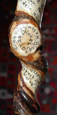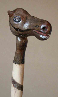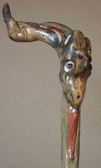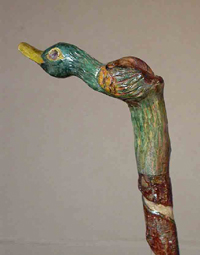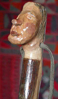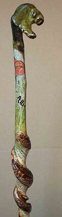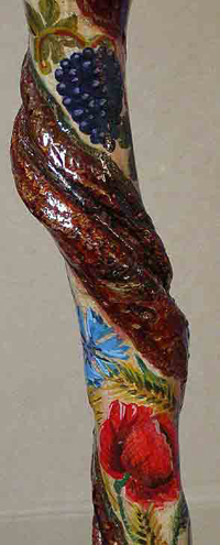 Wanderstöcke geschnitzt und bemalt. Stöcke, die in ihrem Wuchs von einer Waldrebe verdreht wurden, sind dafür die Grundlage. Der Stockknauf ist bei vielen Stöcken eine geschnitzte Rebwurzel.